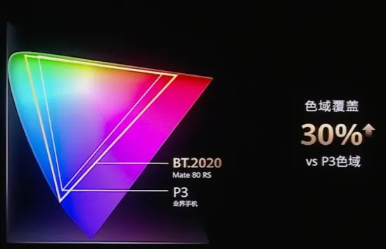 华为Mate 80 RS 超卓众人搭载的是超广域灵珑屏,还加入了BT.2020的广色域。首发全链路BT.2020超广色域技能,而咫尺,主流手机用的还基本是P3色域。