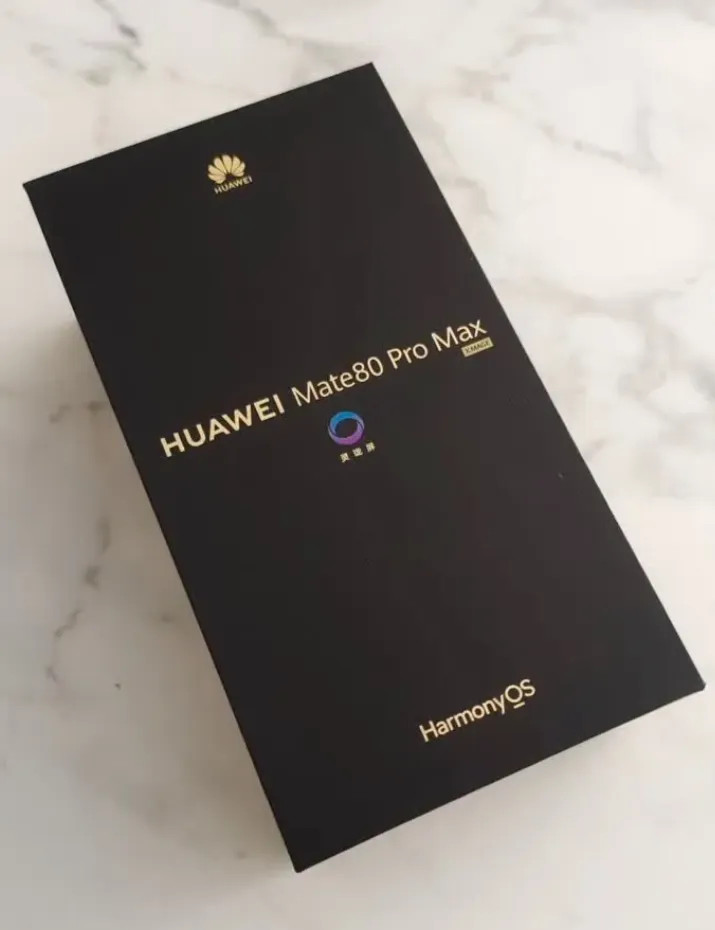 这是华为Mate80 ProMax的包装盒,想象终点爽脆,华为LOGO+机型+鸿蒙。