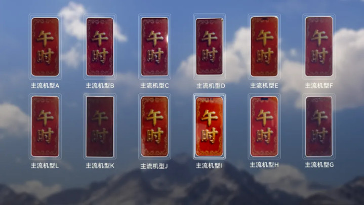 一共12部手机(扫数机型融合控温,确保每台手机屏幕均能证明出最好亮度),每台手机亮度拉到最高,并剖释交流的红色“午时”图片,模拟闲居户外看手机全屏剖释的场景。