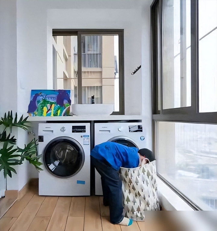 阳台叠放洗烘机加定制柜遮丑,洗衣机上种排绿植,实用和情调两不误。